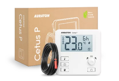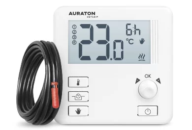 AURATON Cetus P (successor to the AURATON 3013P) is a wired thermostat that operates on a 24-hour cycle, providing precise temperature control in the home. It features a temporary temperature reduction function of 1-5°C for 1-12 hours, allowing for energy savings during the absence of occupants. This temperature controller also includes an external temperature sensor.