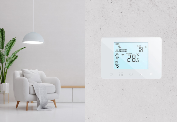 A large, backlit LCD ensures easy reading in any lighting conditions. The thermostat has an elegant look that complements a variety of interiors. LED indicators on the receiver signal the system’s current operating status. An IP20 protection rating and the ability to operate at up to 85% humidity (non-condensing) ensure safe use. The set is an ideal smart solution for modern heating and air conditioning systems.