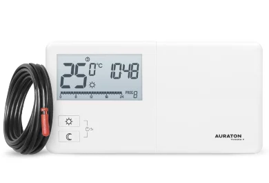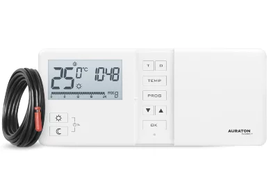 For proper operation of the thermostat, an external temperature sensor on a 2.5m cable, included in the set, must be connected. Thanks to the PWM operating mode, the AURATON Tucana P minimizes temperature fluctuations by cyclically switching the heating device on and off, which contributes to energy savings.