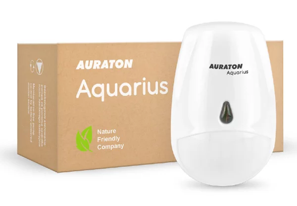 AURATON Aquarius PIR (następca AURATON PIR) to bezprzewodowy czujnik ruchu przeznaczony do automatycznego sterowania pompą cyrkulacyjną w układzie ciepłej wody użytkowej (C.W.U.). Jego głównym zadaniem jest wykrywanie aktywności użytkowników. Kiedy czujnik PIR wykryje ruch w łazience przekazuje informację do odbiornika, który załącza obieg ciepłej wody. To rozwiązanie pozwala włączać ciepłą wodę tylko wtedy, kiedy jest ona niezbędna, co prowadzi do realnych oszczędności i przekłada się na komfort użytkowania. Czujnik AURATON Aquarius PIR można łatwo zamontować na ścianie w łazienkach, w domu, czy biurze. Czujnik nie zbiera danych o użytkownikach, wykrywa tylko ruch, dlatego jest też często stosowany w obiektach użyteczności publicznej.