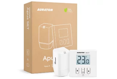 The AURATON Apus SET (successor to AURATON 200 TRA) is an advanced system consisting of an electronic radiator head and a controller, designed for precise and efficient temperature management in rooms. Communication between the devices enables accurate, proportional control of the radiator valve, ensuring optimal thermal conditions and significantly reducing heating costs. The "FrostGuard" function additionally protects rooms from freezing, while the energy-saving mode allows for a cyclic reduction of the programmed temperature by 3°C for 6 hours.
