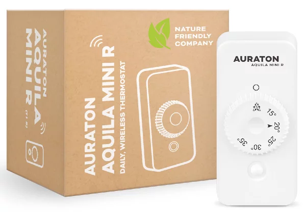 The AURATON Aquila Mini (successor to the AURATON T-1 R) is a wireless thermostat designed with an advanced microprocessor that combines functionality, simplicity, and ultra-efficiency. It is likely the most eco-friendly thermostat in the world, optimized for continuous operation for many years on a single battery