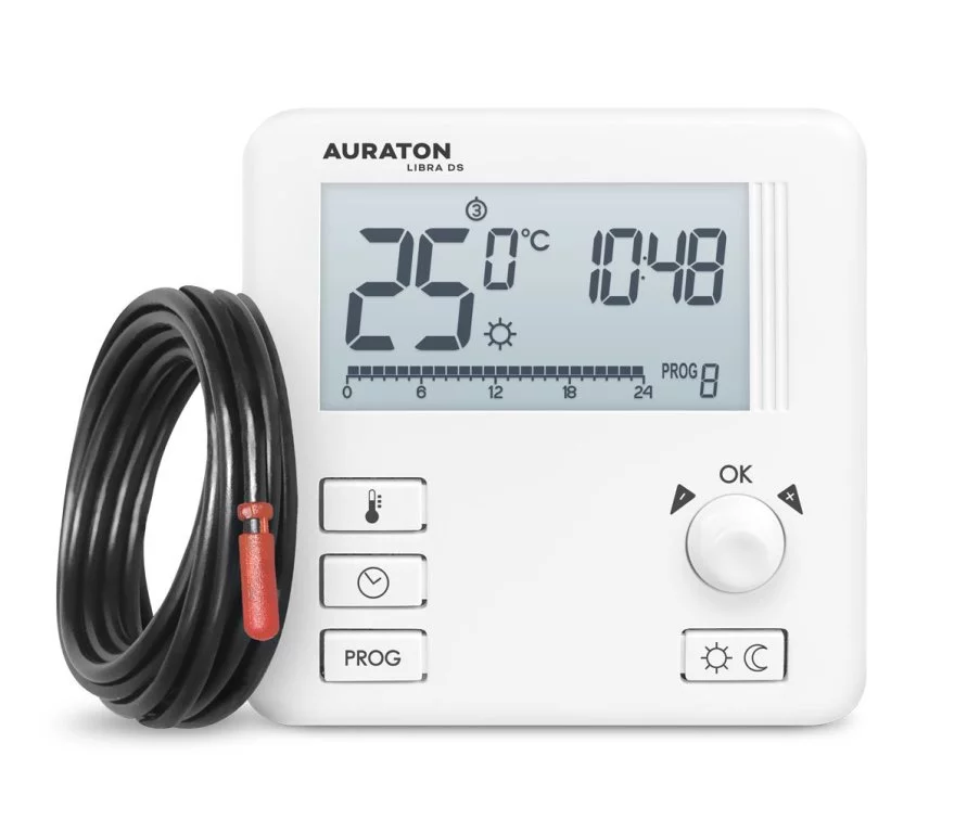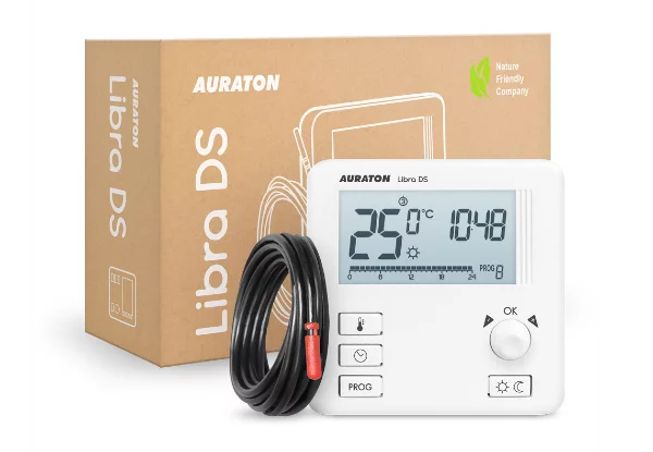 Weekly, wired temperature controller (dual-sensor) AURATON Libra DS (successor to AURATON 3021DS) is an electronic temperature controller that enables weekly temperature programming. The minimal number of buttons ensures efficient and quick operation, increasing user convenience. However, this is not all that distinguishes Libra DS.